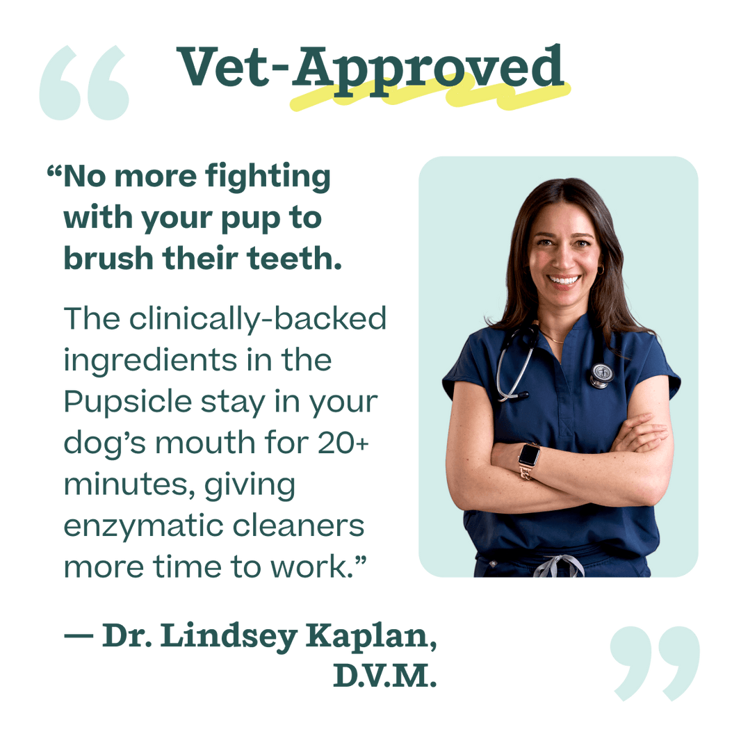 No more fighting with your pup to brush their teeth! This first-of-its-kind dental solution works with the Pupsicle to give your dog 20+ minutes of effortless tooth cleaning. Unlike other enzymatic cleaners that are quickly chewed and swallowed, your pup will get extended contact time to support the health of their teeth and gums. They’ll think they’re getting a delicious distraction, but you know you’re supporting their oral health, clean teeth, and fresh breath with every lick!