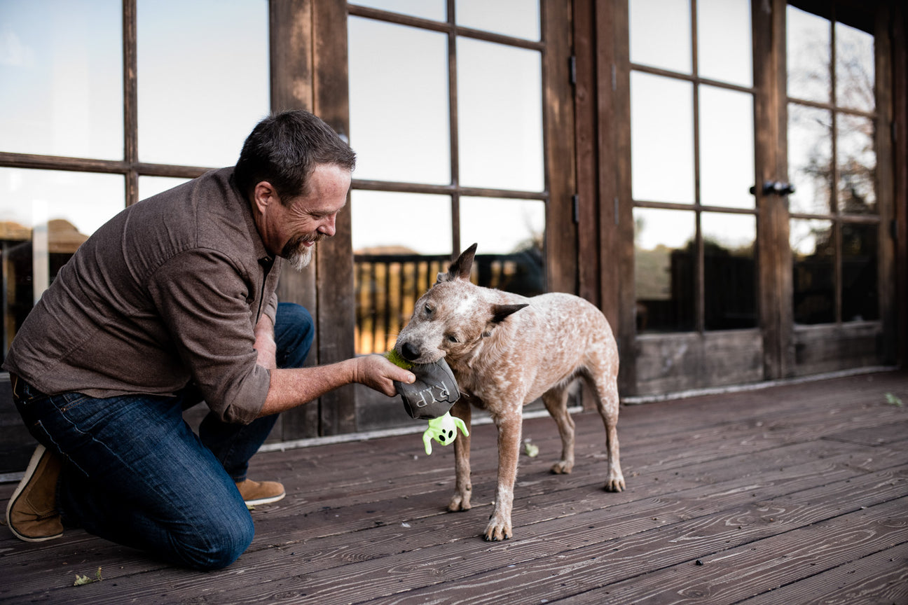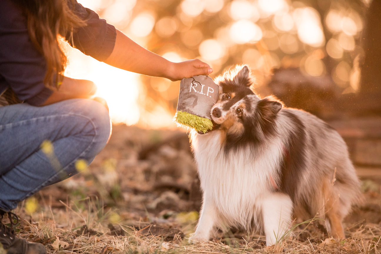 P.L.A.Y.’s Ghoulish Grave toy will add an element of hide and SHRIEK to your dog’s playtime. Hiding behind the squeaky tombstone is a glow-in-the-dark ghost ready to mesmerize them with squeaks and crinkles. Talk about a frighteningly fun good time!
