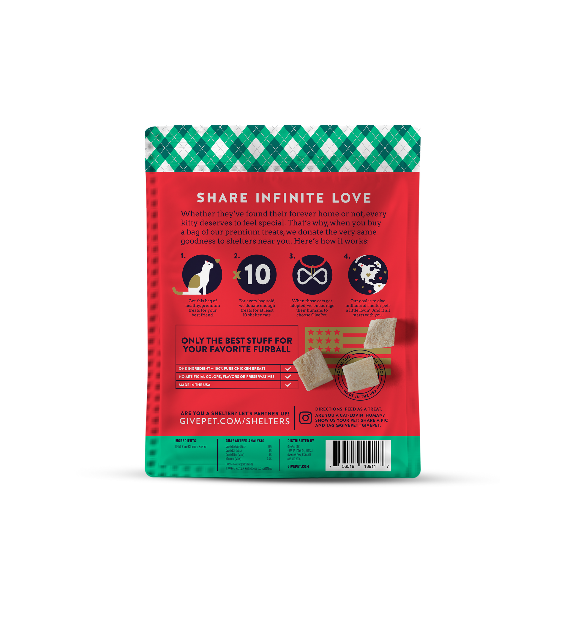 1.25 oz bag of freeze-dried cat treats with one ingredient – 100% pure chicken breast. Designed for even the most finicky of cats! A perfect Christmas gift for your favorite feline!